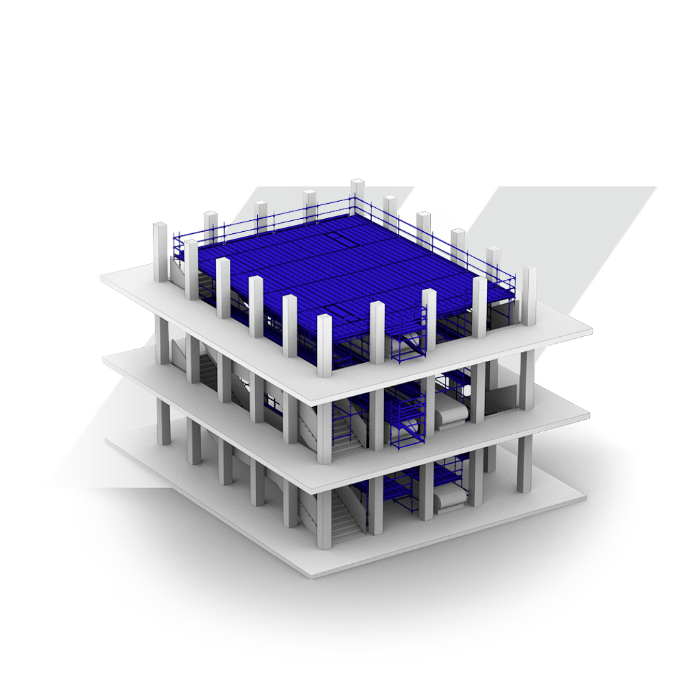 Raumgerüste sind freistehende, dreidimensionale Gerüstsysteme, die sich unabhängig von Wänden oder Fassaden aufbauen lassen. Sie bestehen aus stabilen Stützen, Balken und Plattformen, die miteinander verbunden sind. So entsteht eine sichere und weitläufige Arbeitsplattform, wahlweise auf mehreren Ebenen.